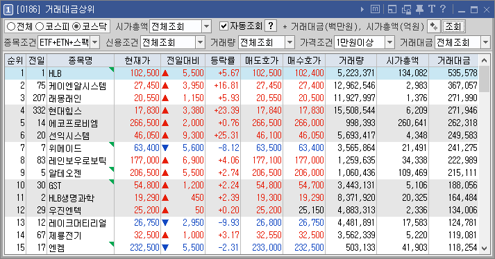 [0186] 거래대금상위, [0184] 당일거래대금상위(거래량/회전율/거래대금)