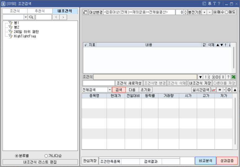 0150 조건검색 창 에서 각자 원하는 조건을 저장한후 조건에 맞는 충족과 이탈하는 종목을